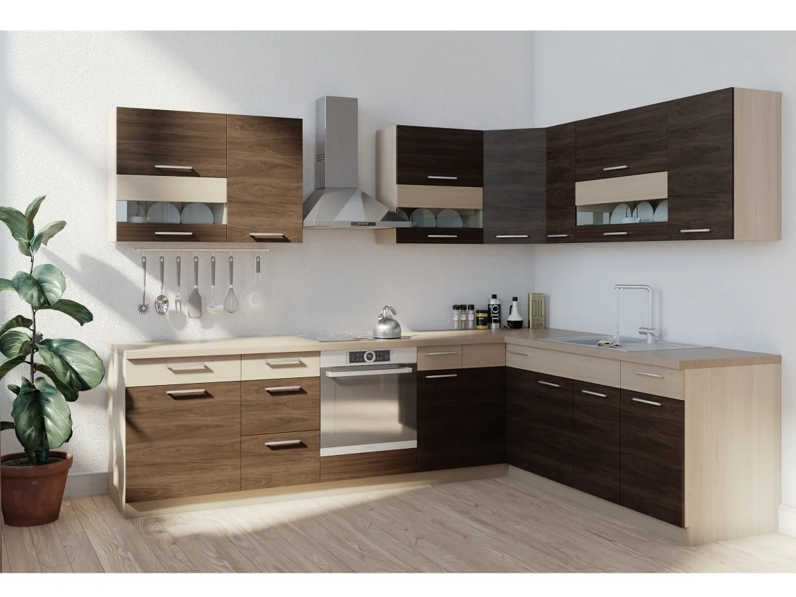 Rohová kuchyně Ruthin o rozměrech 285 × 210 cm představuje flexibilní řešení pro uspořádání kuchyně podle vašich potřeb a možnosti doplnění o další skříňky. Korpus v barvě rijeka světlá a dvířka lze zvolit tmavé či světlé rijeka, čímž vzniká atraktivní kontrast.