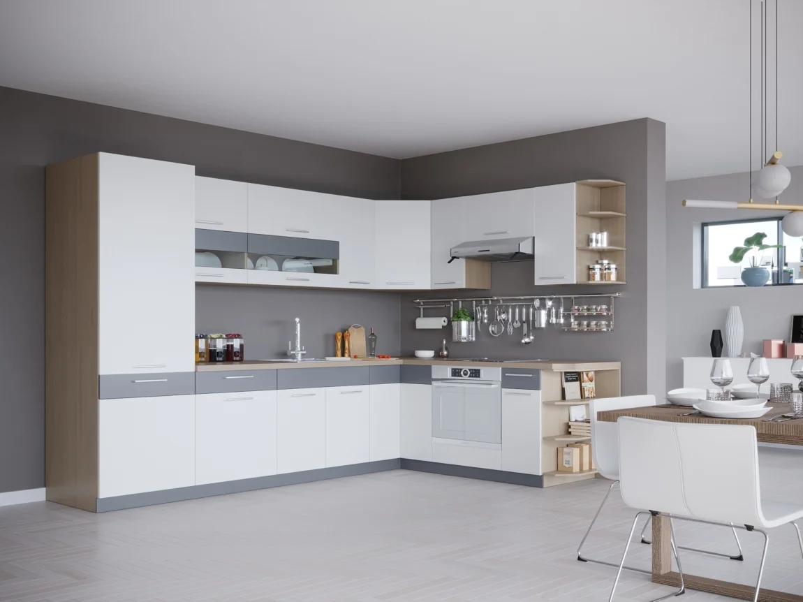 Představujeme rohovou kuchyňskou sestavu Ruthin v rozměrech 290 × 210 cm, která kombinuje světlý korpus Rijeka s dvířky v bílem lesku a grafitovým matným povrchem. Sestava obsahuje horní skříňky (výška 72 cm, hloubka 30 cm) a dolní skříňky (výška 82 cm bez pracovní desky, hloubka 50 cm).