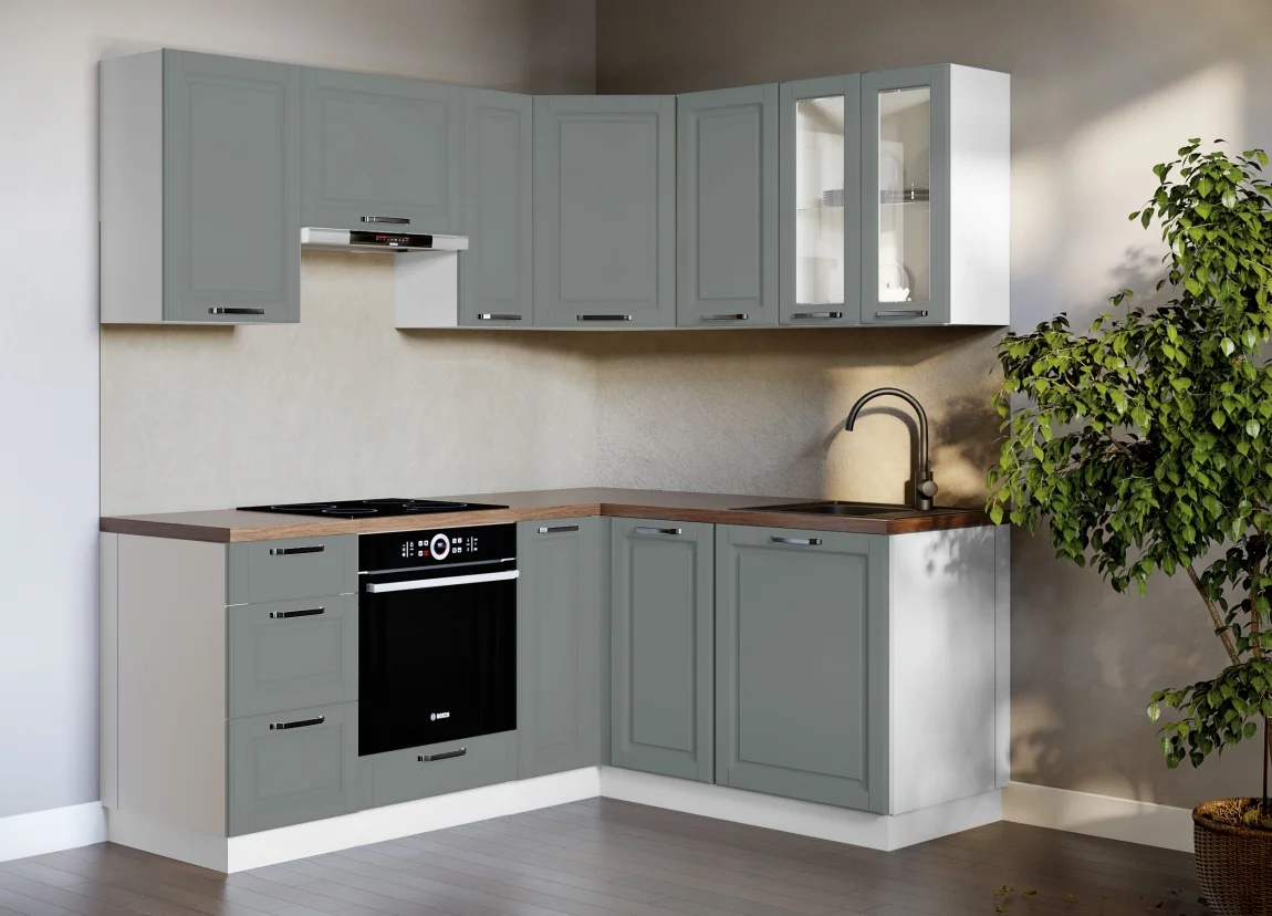 Rohová kuchyně SNOW o rozměru 195 × 160 cm představuje modulární řešení, které lze doplnit o další skříňky nebo sestavit podle vašich představ. Korpus v bílé barvě doplňují šedá dvířka MDF, čímž vzniká moderní kontrast a svěží vzhled.