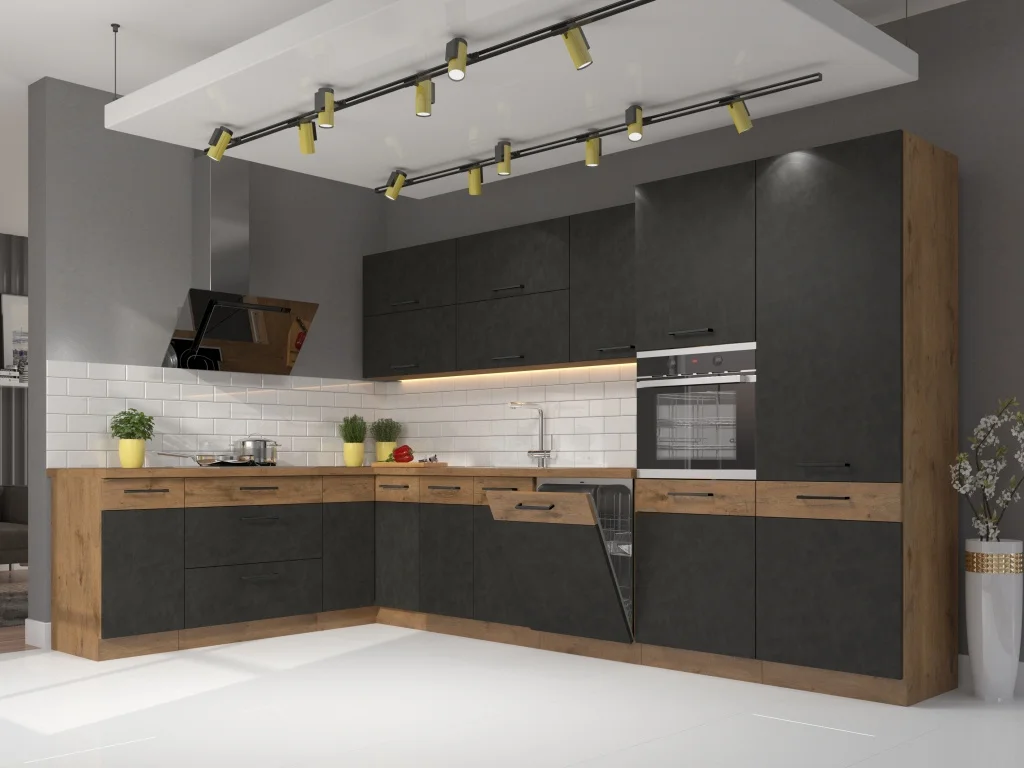 Rohová kuchyně ZEATA nabízí praktické řešení o rozměrech 210 × 350 cm s korpusem v dekoru dub lancelot a dvířky matera/dub lancelot. Tento systém je modulární a jednotlivé skříňky si můžete vybírat a kupovat samostatně, což usnadňuje přizpůsobení prostoru. Příklad konfigurace zahrnuje spodní skříňky 40 cm a 80 cm, rohovou 90×90 cm, skříňku pod dřez, vysoké skříňky pro vestavěnou troubu i horní skříňky 60–80 cm. U dvířek a šuplíků je výhodou tiché dovírání a kovové úchyty v černé barvě dodávají moderní vzhled. Materiál: korpus z lamina s melaminovými hranami a zadní stěnou z HDF; dvířka z lamina s ABS hranami; úchytky jsou kovové. Součástí sestavy nejsou dřez, spotřebiče ani pracovní deska, dodáváno je v demontovaném stavu. Díky modulárnímu uspořádání lze sestavu snadno rozšiřovat nebo měnit její rozměry podle potřeby, kdykoli si ji budete chtít upravit.