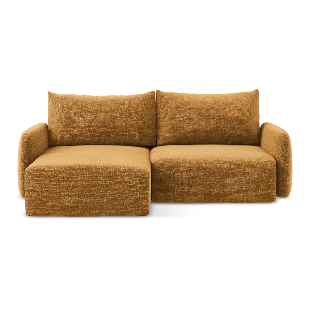 Moderní levá rohová pohovka Kalena v originální oranžové barvě je ideální volbou pro každou obývací pokoj. Její rozkládací funkce zajišťuje pohodlné spaní pro hosty, zatímco integrovaný úložný prostor nabízí praktické řešení pro uskladnění přikrývek nebo polštářů.