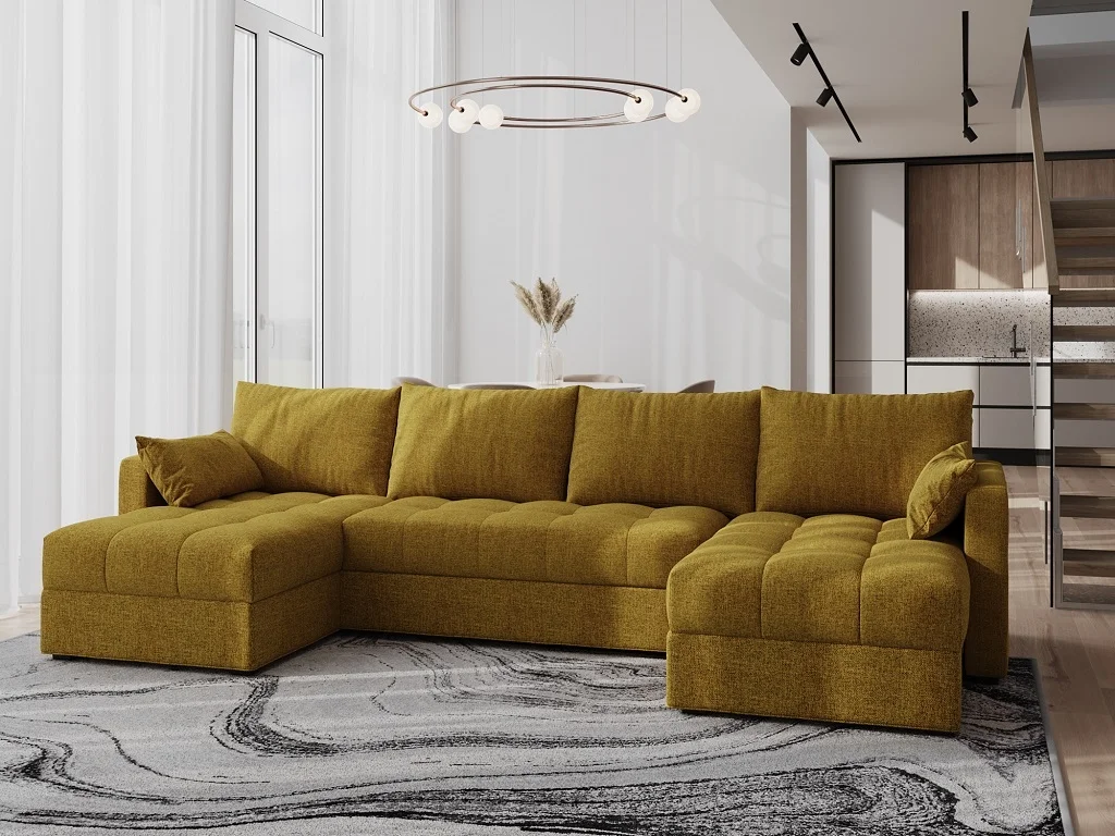 Rozkládací rohová sedačka ve tvaru U je navržena pro pohodlné sezení i jednoduché přespání návštěv. Součástí balení jsou čtyři velké a dva menší polštáře a praktický úložný prostor pro deky a další potřeby. Sedačka je plně čalouněná a má prošívaný sedák, který dodává nadčasový vzhled. Potahová látka Malmo 41 v hořčicové barvě působí teplým dojmem a je vhodná pro každodenní používání. Rozměry: šířka 287 cm, výška 72 cm, hloubka 140 cm; ložná plocha po rozložení 267 x 120 cm; výška sedu 38 cm. Materiál konstrukce zahrnuje polyuretanovou pěnu T30. Nohy jsou nízké a vyrobené z černého plastu; dodání probíhá v demontu. Obrázek s rozměry je ilustrační; skutečná barva provedení se může lišit. Také oceníte, že díky rozkládací funkci ušetříte místo a získáte pohodlné spaní pro hosty.
