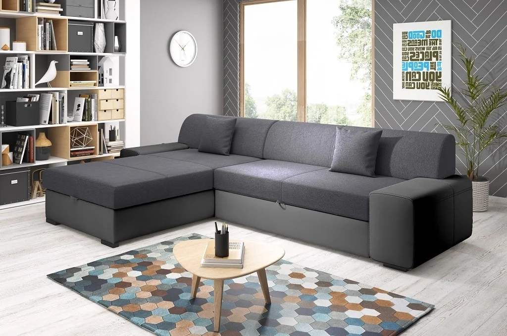 Rohová rozkládací sedačka ANTIOCHIE s levou orientací je vhodná pro moderní i klasické interiéry. Potahová kombinace: Primo 96 v tmavě šedé látce a Madryt 1100 v černé ekokůži je snadno udržovatelná a působí elegantně.