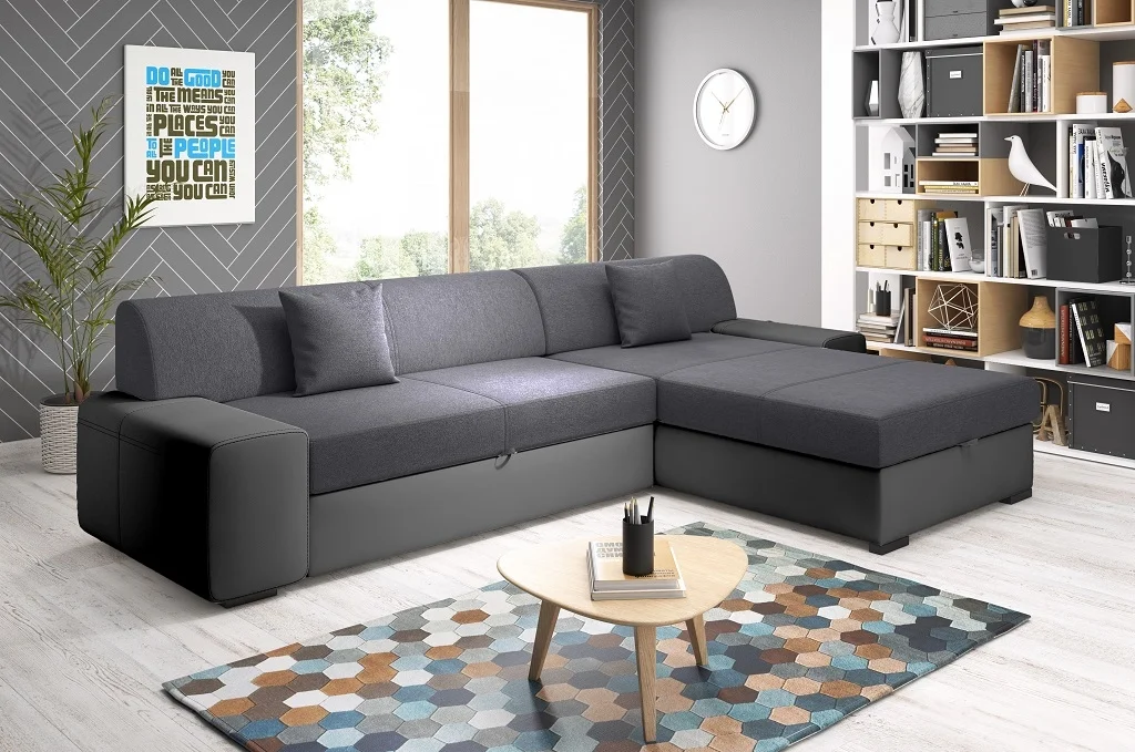 Rohová rozkládací sedačka ANTIOCHIE s pravou orientací spojuje stylový vzhled s praktickou funkcí pro moderní obývací pokoj. K dispozici jsou varianty potahu v tmavě šedé látce Primo 96 nebo v černé ekokůži Madryt 1100, a součástí balení jsou dva dekorativní polštáře spolu s prostorným úložným prostorem.