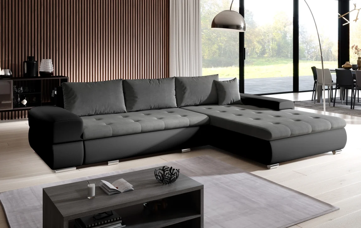 Tato rozkládací rohová sedačka COLORITO 11 nabízí flexibilní uspořádání — roh lze upravit na pravou i levou stranu podle prostoru. Potah tvoří šedá látka Orinoco 96 a černá ekokožená Madryt 1100, čímž vzniká moderní kontrast, který je zároveň odolný a praktický.