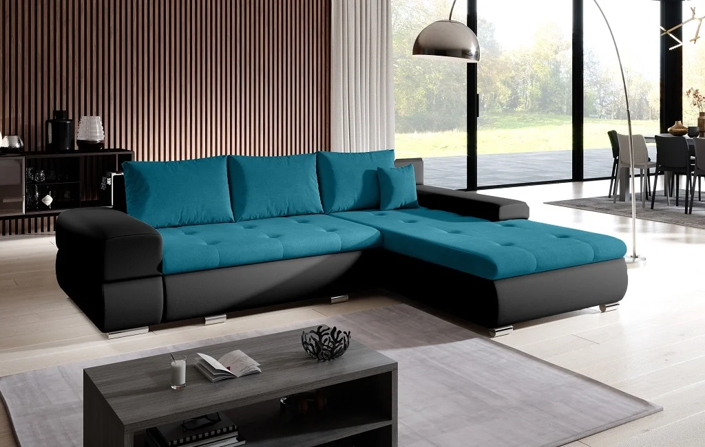 Potahové varianty: látka Orinoco 85 v tyrkysové a ekokůže Madryt 1100 v černé zajišťují kombinaci materiálů a vzhledu. Součástí jsou odnímatelné polštáře na zip a úložný prostor pro ukládání lůžkovin a drobných věcí. Sedačka je plně čalouněná a vhodná pro větší prostory, s ložnou plochou 200 x 150 cm a sedací výškou 39 cm. Rozměry rámu: 275 x 83 x 190 cm, hloubka sedu 65 cm (90 cm bez polštářů). Úložný prostor měří 130 x 70 cm. Materiál kombinuje pružinu vlnitou a PUR pěnu T30, což zajišťuje pevnost a komfort. Nohy jsou kovové chromované a sedačka se dodává v demontu. Rozměry a hmotnosti balíků bývají uvedeny v technických údajích u produktu.
