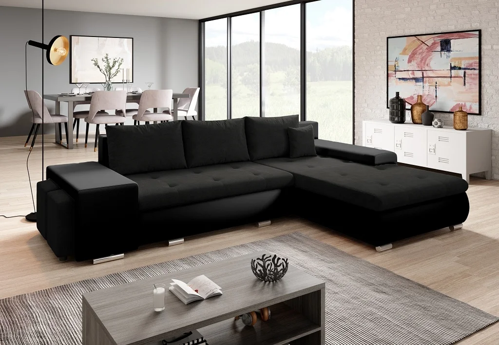 Potah si vyberete ze dvou variant: Orinoco 100 tmavě šedá látka nebo Madryt 1100 černá ekokůže, takže vzhled i údržba odpovídají vašim preferencím. Celý čalouněný systém je určen do prostoru a nabízí pohodlné sezení i praktické využití úložného prostoru. Rozměry: celé sestavení má šířku 290 cm, výšku 83 cm a hloubku 190 cm (bez polštářů je hloubka 80 cm); ložná plocha činí 200 × 150 cm. Výška sedu 39 cm, hloubka sedu 65 cm (po odebrání polštářů 90 cm). Rozměry úložného prostoru 148 × 70 cm a taburetů 40 × 38 × 40 cm. Konstrukce kombinuje pružinu vlnitou a pěnu T30; nohy jsou kovové, chromované. Dodáváno v demontu. Pro transport se uvádí čtyři balíky s uváděnými rozměry. Praktické řešení pro zázemí obývacího prostoru díky možnosti orientace rohu, úložnému prostoru a dalšímu komfortu pro denní použití a příležitostné spaní pro hosty.