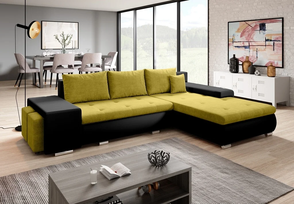 Rohová rozkládací sedačka COLORITO MINI T5 v provedení žluté látky a černé ekokůže je koncipována pro flexibilní uspořádání prostoru. Díky možnosti montáže rohu na pravou i levou stranu ji lze jednoduše přizpůsobit každému interiéru. Součástí jsou polštáře se zipem, dva taburety a úložný prostor, které zajišťují praktické využití prostoru v každé místnosti. Potahové materiály kombinují žlutou látku Orinoco 40 a černou ekokůži Madryt 1100, což dodává vzhled i odolnost pro každodenní provoz. Rozměry celkové: šířka 290 cm, výška 83 cm, hloubka 190 cm; ložná plocha 200 x 150 cm; výška sedu 39 cm a hloubka sedu 65 cm (bez polštářů 90 cm). Úložný prostor má 148 x 70 cm a taburety měří 40 x 38 x 40 cm. Sedačka je celočalouněná a dodávána v demontu, což usnadňuje dopravu a montáž. Pro pohodlnější využití ji lze doplnit o polštáře a během chvilky proměnit v pohodlné lůžko pro hosty.