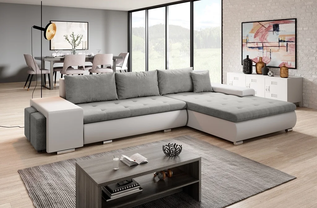 Rohová rozkládací sedačka COLORITO T8 kombinuje moderní design s praktickou funkcí a díky možnosti orientace rohu na pravou či levou stranu se snadno přizpůsobí prostoru. K dispozici jsou dvě materiálové varianty: světlá látka Orinoco 90 v odstínu světle šedé a bílá ekokůže Madryt 120, které umožňují variabilní kombinace povrchů podle vašeho stylu.