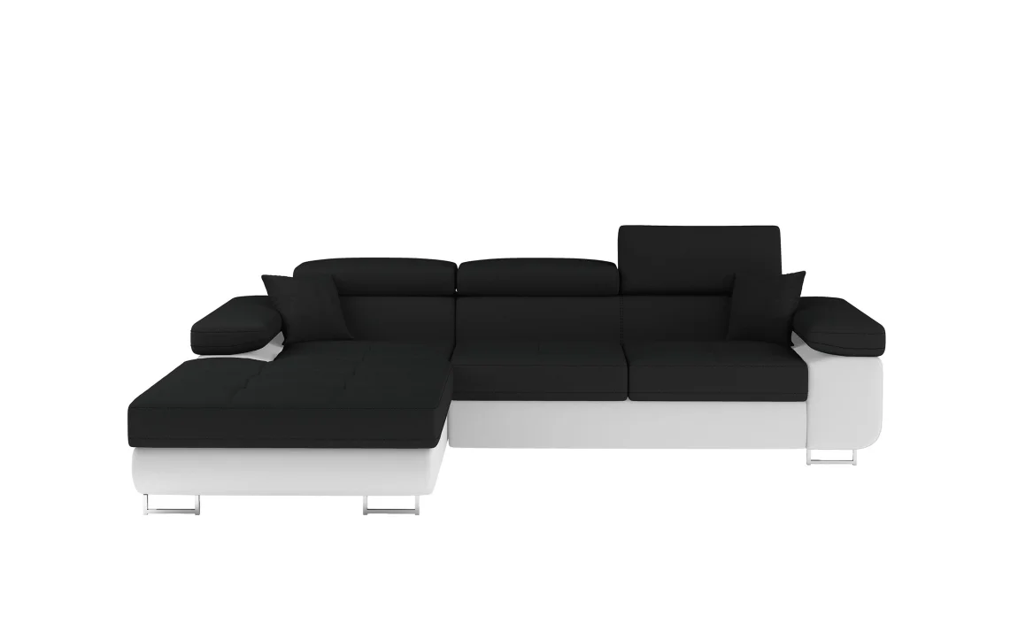 Rohová rozkládací sedačka DARPOL 43 má levé provedení a působí elegantně díky kontrastu černé látky a bílé ekokůže. Zadní část sedačky je potažena látkou, takže ji lze umístit i volně v prostoru bez nutnosti dotahovat ji ke zdi.