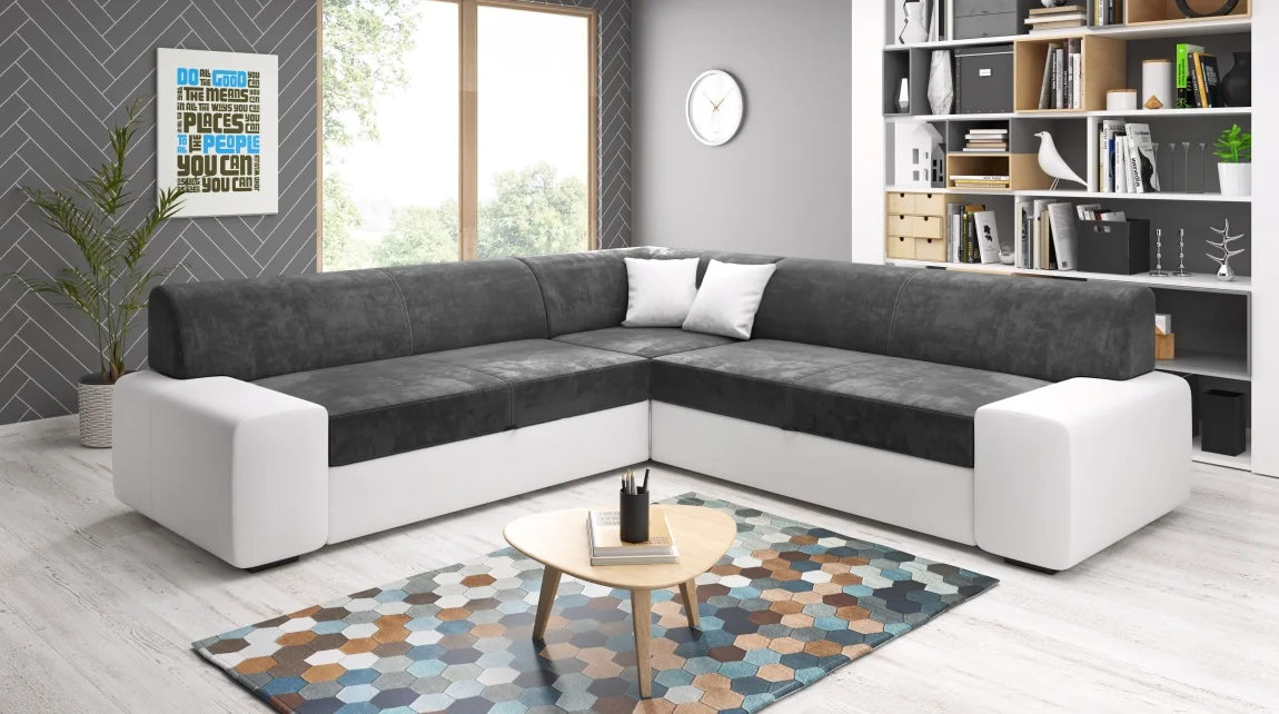 Rohová rozkládací sedačka Jermaine Maxi se přizpůsobí vašemu prostoru díky možnosti montáže rohu na pravý i levý směr. Povrch tvoří kombinace materiálů: tmavě šedá látka Monolith 97 a bílá ekokůže Madryt 120, které spolu tvoří moderní kontrast a komfort.