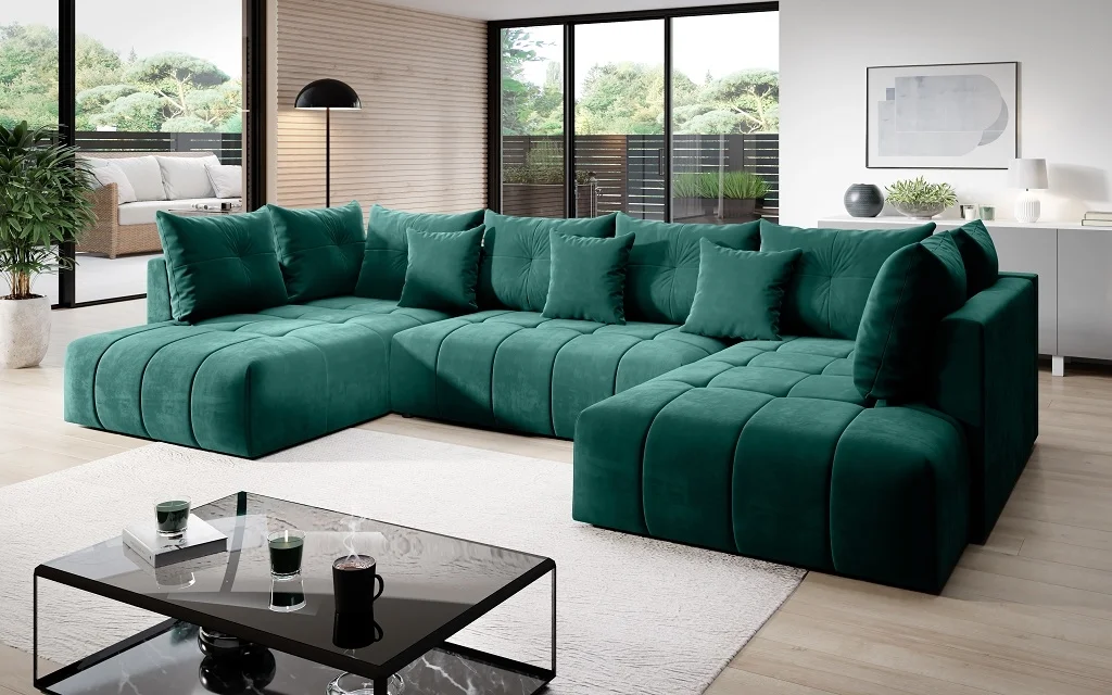 Rohová rozkládací sedačka Jordan XXL ve tvaru U přináší do obýváku prostorný komfort a moderní vzhled. Potahová látka Monolith 37, zelená, je odolná a působí svěže. Sedačka je celočalouněná a součástí jsou polštáře se zipem spolu s úložným prostorem.