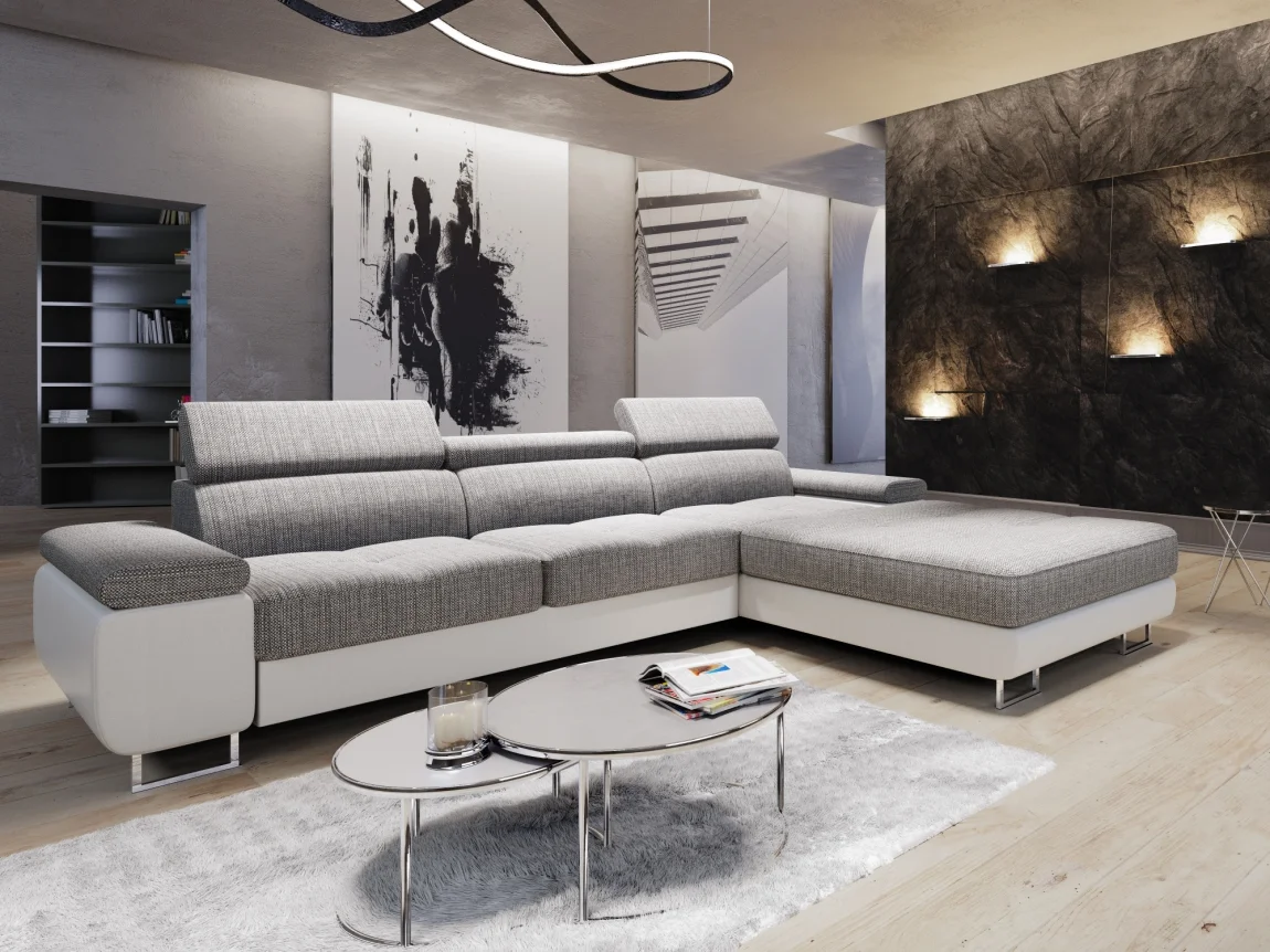 Rohová rozkládací sedačka LAING MINI s pravou orientací je praktickým řešením pro prostorný obývací pokoj. Dvoubarevný potah kombinuje šedou látku Kornet 02 s prošíváním bílo-černými nitěmi a bílou ekokůží Dolaro 511, čímž vzniká elegantní a snadno udržovatelný vzhled. Součástí jsou tři nastavitelná záhlavníky, rozkládací mechanismus s výsuvnou matrací Delfin a úložný prostor v otomanu. Sedačka je kompletně čalouněná a díky celočalounění působí impozantně v každém interiéru. Celkové rozměry činí 273 cm na šířku, výška sedu je 38 cm a hloubka 68–88 cm (podle polohy opěrek); po rozložení vznikne ložná plocha 211 x 125 cm. Šířka otomanu je 103 cm, opěrky mají rozměry 50/28 cm a výška záhlavníků 70/28 cm. Konstrukci tvoří pružina vlnitá a pěna T30 (středně tvrdá); nohy jsou poniklované, což zajišťuje stabilitu a moderní vzhled. Dodáváno v demontu pro snadnou montáž.