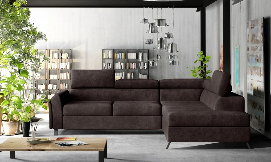Rohová rozkládací sedačka LAVRANIA 18 s pravým provedením je čalouněná hnědou látkou Dora 28. Při fotografii je zobrazena rozložená konfigurace; skutečná barva látky může být mírně odlišná.