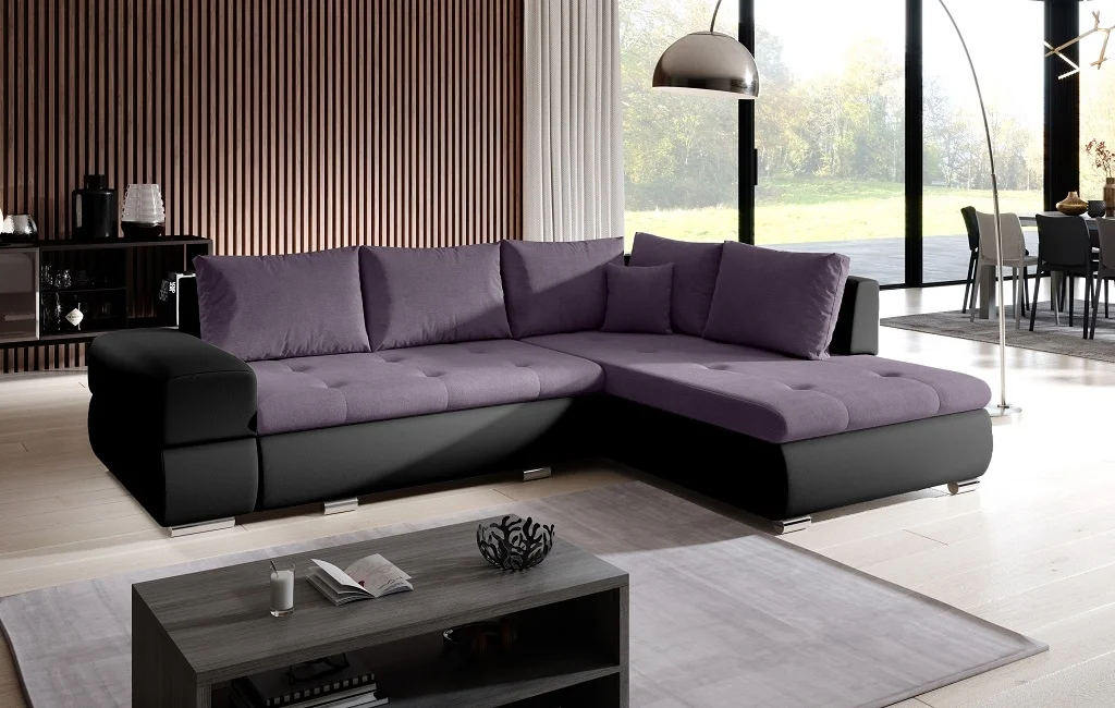 Osvěžte obývací prostor stylovou Rohová rozkládací sedačka LYKIE v působivé kombinaci fialové látky a černé ekokůže. Rohový díl lze snadno montovat jak na pravé, tak na levé straně, takže přizpůsobíte uspořádání místnosti podle potřeby.