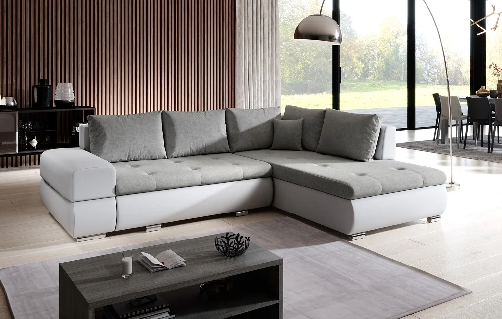Rohová sedačka LYKIE je flexibilní volba pro každý prostor, kterou lze nastavit i jako pravý nebo levý roh. K dispozici jsou potahy Orinoco 90 ve světle šedé a Madryt 120 v bílé ekokůži, takže si vyberete podle stylu interiéru.