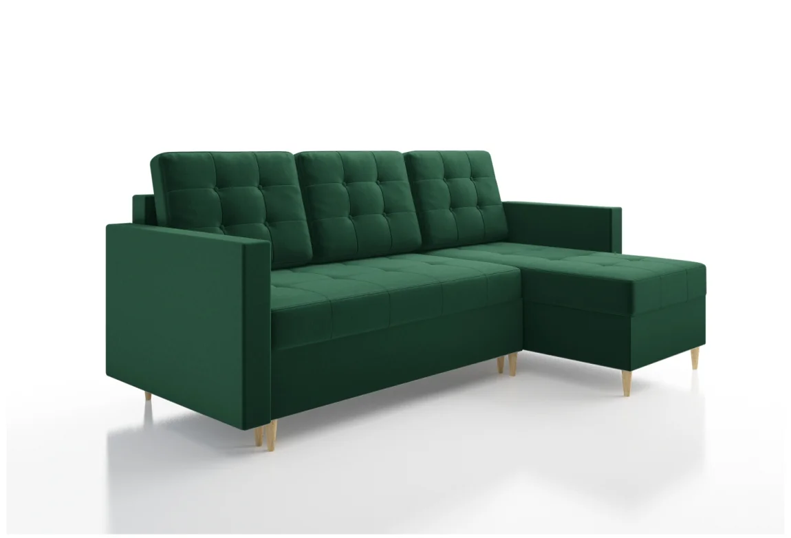 Rozkládací rohová sedačka MELANCANTA v zelené látce Kronos 19 nabízí pohodlné posezení a praktické spaní pro hosty. Pevnou konstrukci tvoří bukové nohy a výplň z polyuretanové pěny T30, která zajišťuje stabilní oporu.