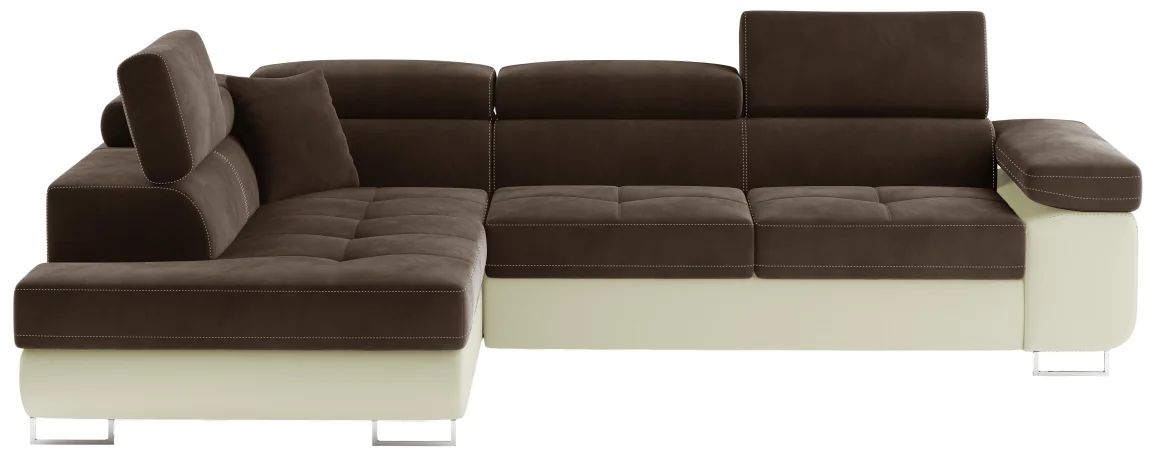 Rohová rozkládací sedačka MENDON 05 se dodává v levém provedení a kombinuje hnědou látku Jasmine 29 s béžovou ekokůží Soft 33. Zadní část je čalouněná látkou, takže ji lze umístit i volně v prostoru bez nutnosti opření o zeď.
