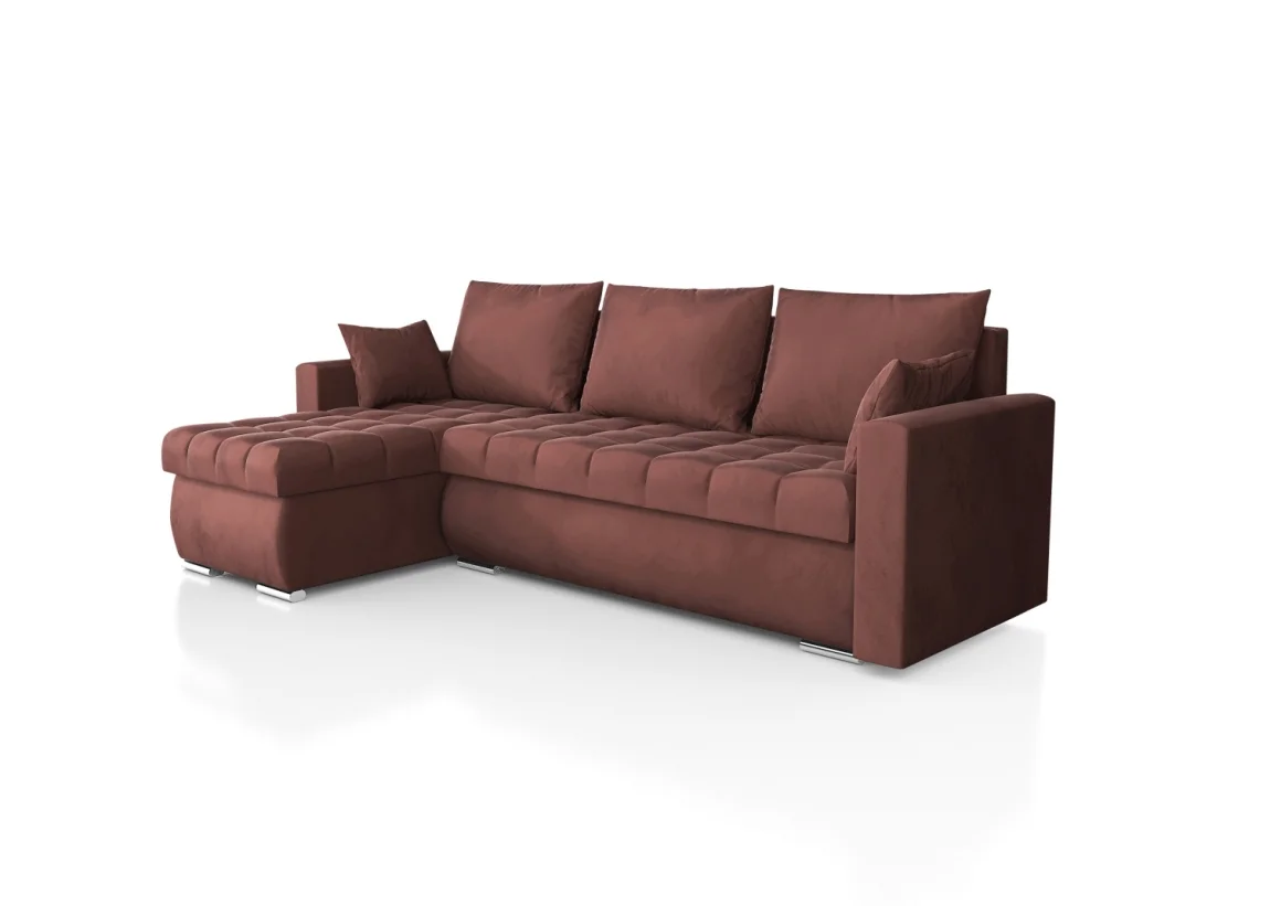 Rohová rozkládací sedačka MIRABILIS v odstínu růžové látky K29 je praktickým řešením pro moderní obývací pokoj. Rozkládací mechanismus DL umožňuje rychlé a pohodlné rozložení na spaní o rozměrech 125 x 200 cm. Podsedák je tvořen bonelovými pružinami a potah představuje látka Mikado 07 – růžová, zatímco chromované nohy ve tvaru válce dodávají sedačce stylový vzhled. Celkové rozměry: šířka 238 cm, výška 72 cm (bez polštářů) a hloubka 148 cm; výška sedu 41 cm a hloubka sedu 80 cm (bez polštářů). Sedačka má čalouněná záda, takže ji lze umístit i volně v prostoru. Dodáváme ji v demontu pro pohodlnou montáž a dopravu. Látka Mikado 07 je příjemná na dotek a snadná na údržbu, což znamená dlouhodobě hezký vzhled i bez náročné péče.