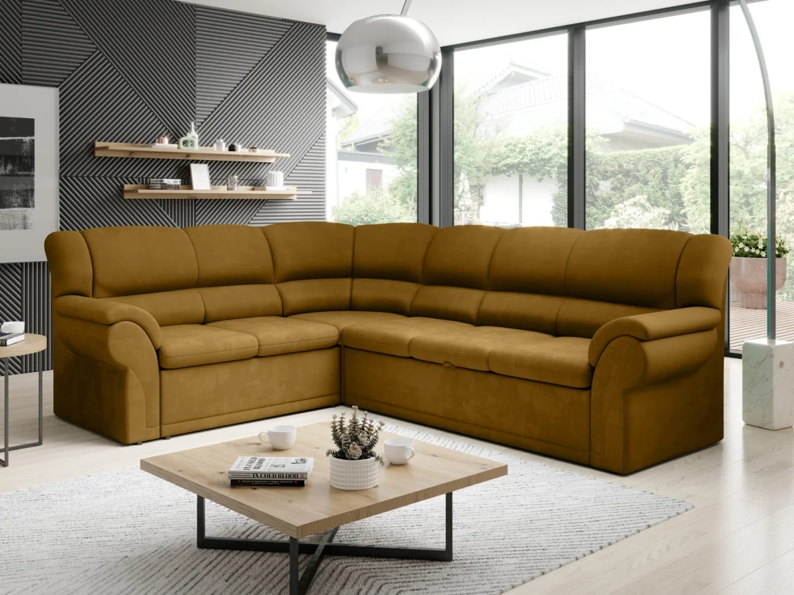 Rohová rozkládací sedačka MUSTELIN ve levém provedení je čalouněná hořčicovou látkou monolith 48, která dodává moderní a svěží vzhled. Rozkládací mechanismus umožňuje pohodlné spaní na ploše 205 x 120 cm, zatímco výška sedu 45 cm a hloubka 50 cm zajišťují komfort během posezení i odpočinku.