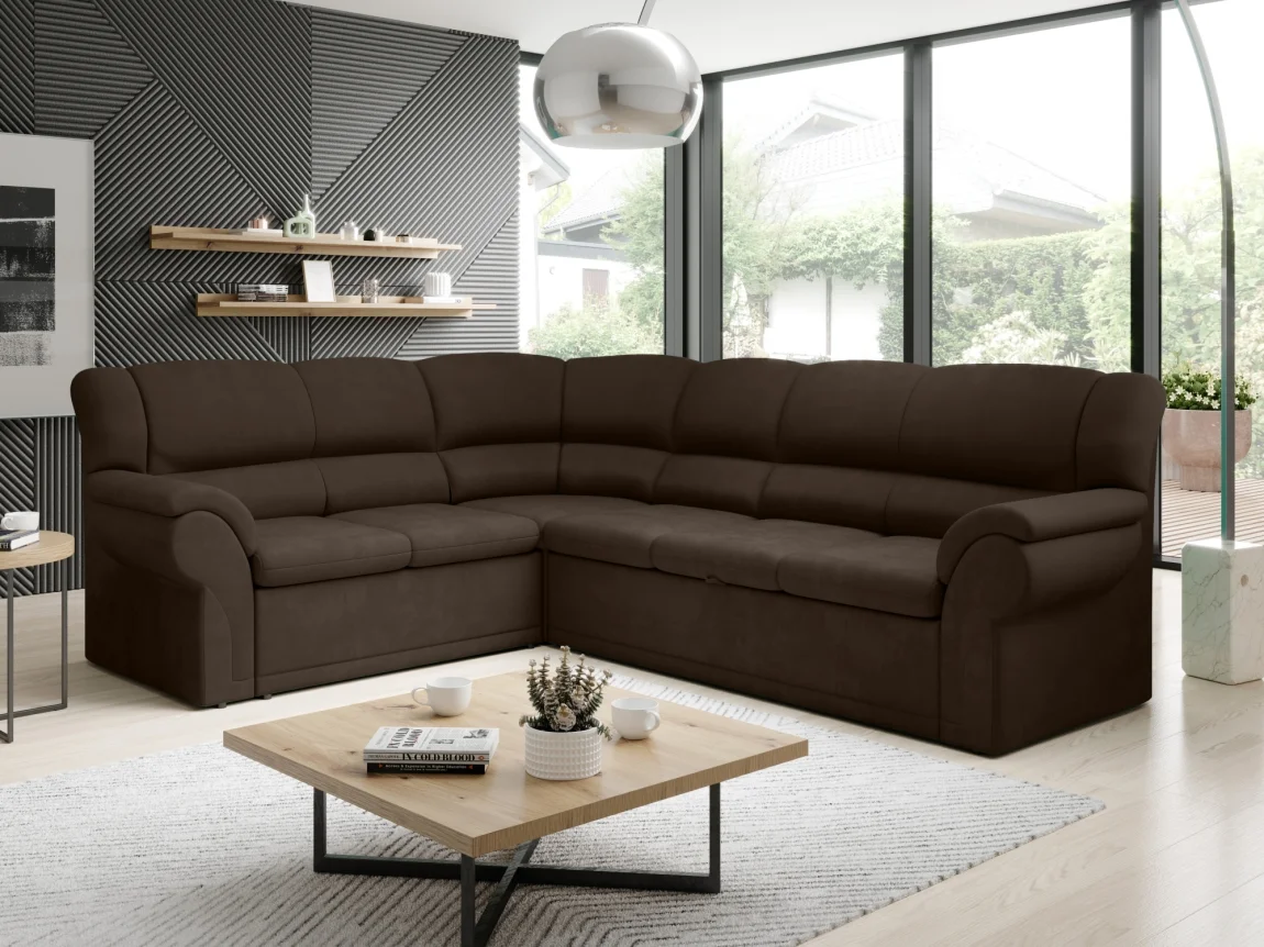 Rohová rozkládací sedačka MUSTELIN, provedení levé strany, v tmavě hnědé látce Monolith 29, spojuje styl s praktičností. Pro pohodlí slouží systém vlnitých pružin a pěny T30, který zajišťuje komfort během sezení i při odpočinku.