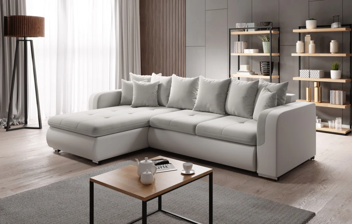 Rohová rozkládací sedačka PARDUS MINI s levou orientací nabízí prostorné sezení a snadné začlenění do interiéru. dvoubarevné provedení kombinuje světle šedou látku milo 25 a bílou ekokůži madryt 120 pro atraktivní vzhled a jednoduchou údržbu.