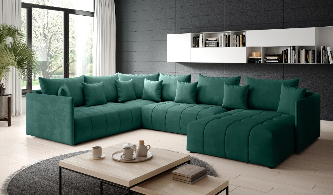 Univerzální rohová rozkládací sedačka Purdy BIS se dá snadno přizpůsobit prostoru, rohy lze orientovat na pravou i levou stranu. Potahová látka Monolith 37 v zeleném odstínu zajišťuje elegantní vzhled a snadnou údržbu.