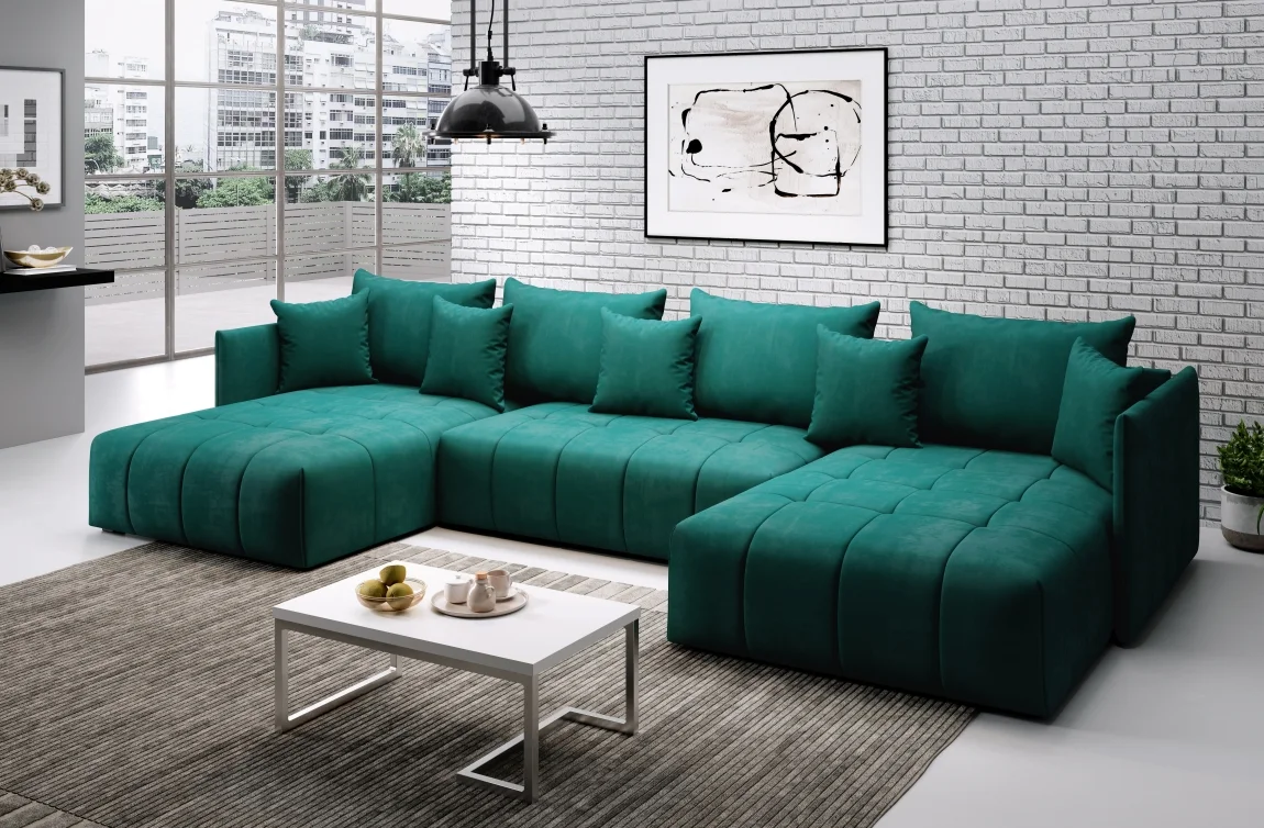 Rohová rozkládací sedačka PURDY U nabízí flexibilní uspořádání prostoru, přičemž roh lze bez problémů přestavět na pravý i levý směr podle prostoru. Potah zelené látky monolith 37 dodává moderní vzhled a odolnost; součástí jsou polštáře se zapínáním na zip pro snadné vyprání a údržbu.