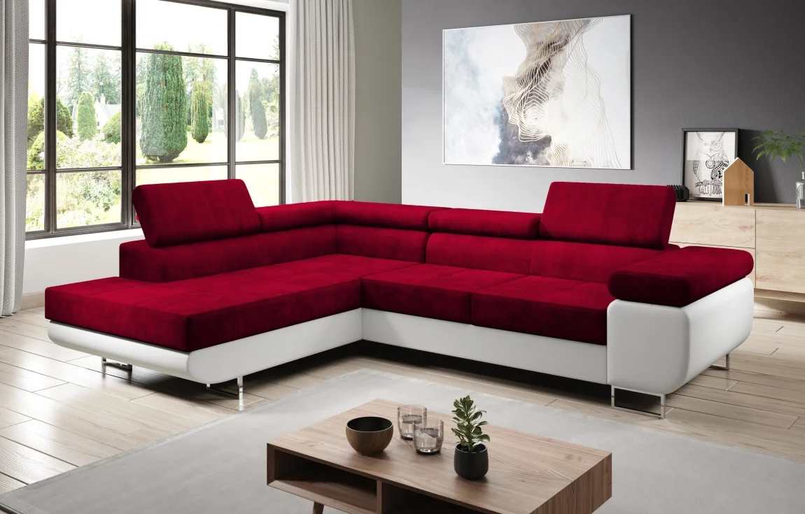 Rohová rozkládací sedačka SINGER L s levým provedením kombinuje moderní dvoubarevný vzhled a praktické řešení pro menší i střední prostory. Potah tvoří červená látka Kronos 02 v kombinaci s bílou ekokůží Madryt 120, což vytváří atraktivní kontrast.