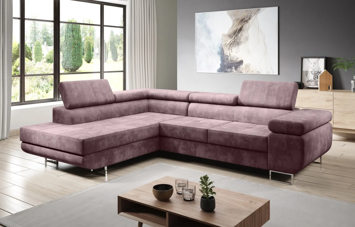 Rohová rozkládací sedačka pro levou orientaci v odstínu starorůžová je potažena látkou Kronos 27. Sedačka má pevná záda se sklopným záhlavníkem a úložný prostor pro ložní prádlo a další potřeby.