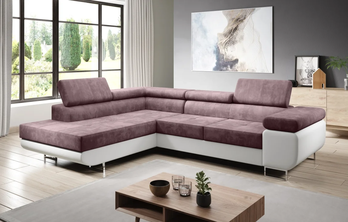 Pro rozkládací rohová sedačka SINGER L se jedná o levé provedení, které kombinuje starorůžovou látku Kronos 27 s bílou ekokůží Madryt 120 a působí elegantně i moderně. Sedačka má pevné opěráky, k nimž patří sklápěcí záhlavník a praktický úložný prostor pro deky a polštáře.