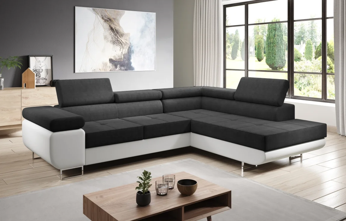 Rohová rozkládací sedačka SINGER L v pravé orientaci spojuje moderní vzhled s praktičností pro každý obývací prostor. Dostupné potahy zahrnují černošedou látku Orinoco a bílou ekokůži Madryt 120, které zajistí snadnou údržbu a nadčasový styl.