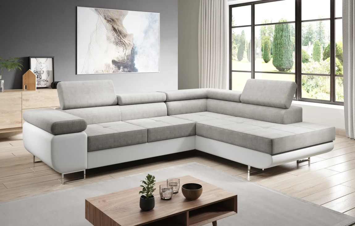 Rohová sedačka s rozkládací funkcí na pravé straně kombinuje moderní vzhled s praktičností pro každodenní použití. Potahová kombinace zahrnuje látku Orinoco 21 se šedým nádechem a bílo‑ekokůži Madryt 120, která zvyšuje odolnost vůči opotřebení a usnadňuje údržbu.