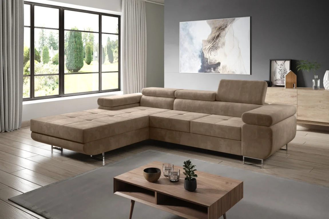Rohová rozkládací sedačka SINGER, levá orientace, v provedení světle hnědé látky Monolith 09, kombinuje elegantní vzhled s praktickou funkčností. Úložný prostor a pevná záda se sklopným záhlavníkem poskytují komfort i pořádek v obývacím prostoru.