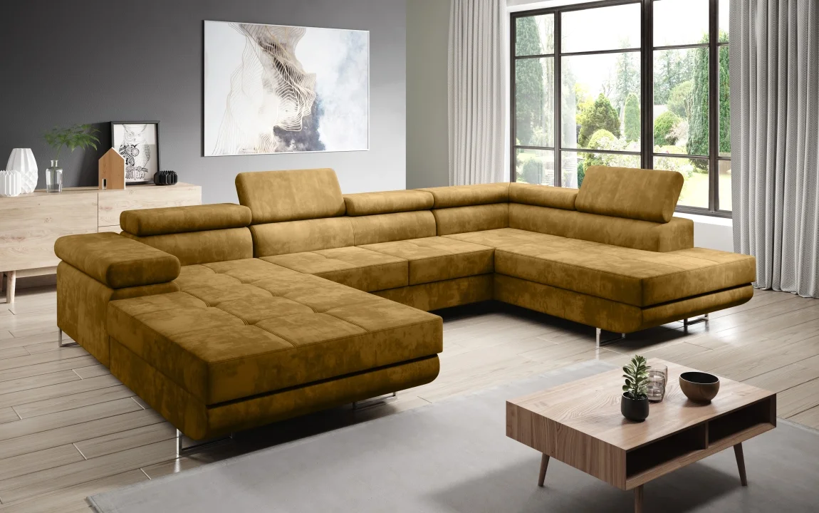 Rohová rozkládací sedačka SINGER U se hodí pro prostorné obývací pokoje a nabízí pohodlné rozkládání na noc. Je určena pro pravé rohové uspořádání a potažena látkou Kronos 01 v odstínu hořčicová, která dodává interiéru teplý a elegantní nádech.