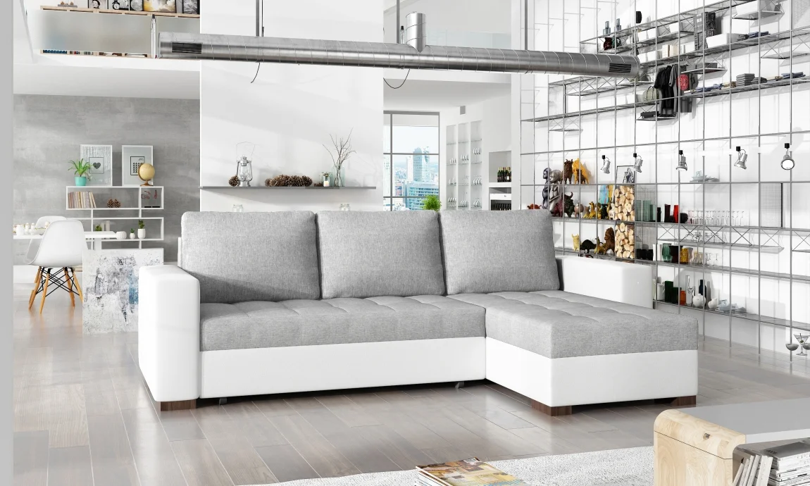 Zadní část sedačky je potažena látkou, což umožňuje její umístění i volně do prostoru bez nutnosti opory ze zadu. Potažení tvoří kombinace Sawana 21, světle šedé látky, a Soft 17, bílé ekokůže, pro moderní kontrast a snadnou údržbu. Na ilustraci je rozložená sedačka zobrazena jen pro demonstrační účel; skutečná barva může být mírně odlišná. Sedačka má bonellové pružiny a nohy z dřeva, což zajišťuje stabilitu a komfort. Rozměry: 237 x 150 x 90 cm, výška sedu 41 cm, hloubka 57 cm; spací plocha 195 x 125 cm. K dispozici jsou dvě úložné prostory, které usnadní pořádek v bytě. Dodáváme v demontu a se zárukou 24 měsíců.