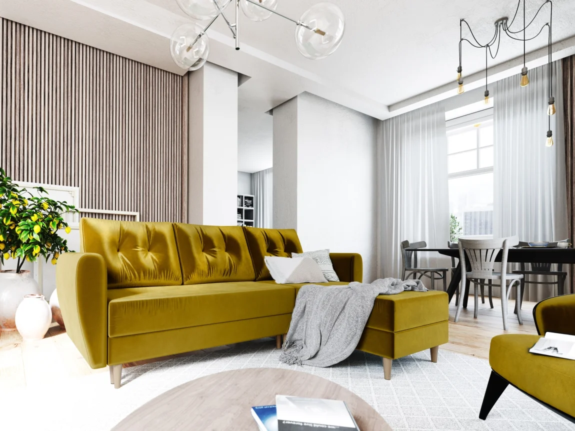 Rohová rozkládací sedačka SKYANG – L tvar, žlutá látka Sedací soupravy