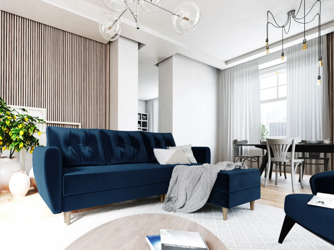 Rohová rozkládací sedačka SKYANG v modré látce nabízí pohodlné posezení a praktický nocleh v jednom. Tvar do písmene L umožňuje montáž rohu na pravou i levou stranu podle rozmístění místnosti.