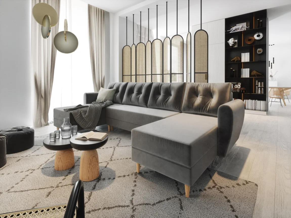 Rohová rozkládací sedačka SKYANG ve tvaru U je potažena tmavě šedou látkou Itaka 14, která působí elegantně a zároveň usnadňuje údržbu. Voděodolná látka chrání vlákna před tekutinami a skvrny zůstávají na povrchu, což usnadňuje čištění.