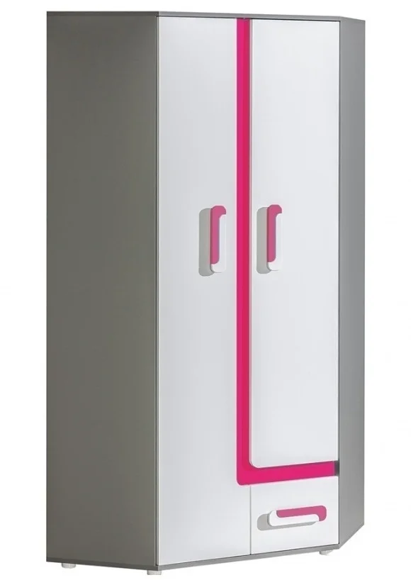 Rohová šatní skříň z sektorové řady vyniká netradičním barevným provedením a originálními úchyty, které zaujmou mladší generaci. Korpus je vyroben z kvalitní LTD desky s ABS hranou v barvě antracit, dveře jsou bílé matné a doplňkovou barvou je růžová.