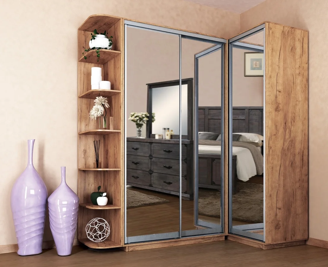 Rohová šatní skříň SEVERA 180×220 cm – dub kraft zlatý se zrcadly Předsíňové stěny