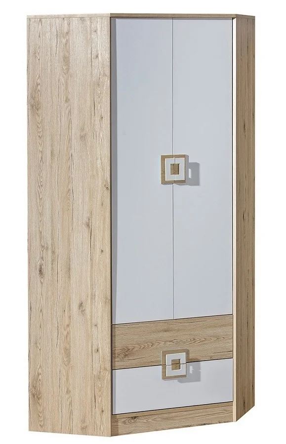 Rohová šatní skříň UWARA kombinuje svěží dub jasný korpus s bílými matnými dveřmi a vytváří moderní vzhled vhodný pro dětský, studentský pokoj i ložnici. Je vyrobena z kvalitní LTD desky s ABS hranou, která zajišťuje dlouhou životnost a odolnost proti opotřebení. Korpus je v dub jasný, dveře v bílé matné barvě a úchytky tvoří kombinaci dub jasný / bílá. Uvnitř najdete šatní tyč, 3 police a dole 2 zásuvky. Tento modulární systém sektorového nábytku umožňuje snadné doplňování a rozšíření o další prvky podle vašich potřeb. Rozměry: výška 190 cm, šířka 87 cm, hloubka 87 cm. Dodáváno v demontu. Záruka 24 měsíců.