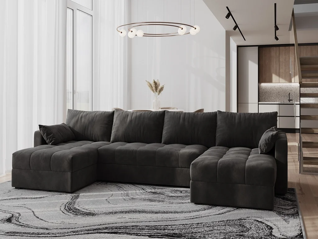 Rohová rozkládací sedačka ALISTAIR U ve tvaru U kombinuje styl s praktičností pro váš obývací pokoj. Součástí balení jsou čtyři velké a dva menší polštáře a praktický úložný prostor pro deky a doplňky. Sedačka je celočalouněná, což zajišťuje elegantní vzhled a dobře zapadne do větších prostor. Sedák je prošívaný, což dodává designový detail i pevnost. Rozměry: 287 x 72 x 140 cm, ložná plocha 267 x 120 cm, výška sedu 38 cm. Potahová látka Mikado 16 v tmavě šedé barvě dodává moderní, nadčasový vzhled. Dodáváno v demontu. Díky rozkládací funkci snadno proměníte rohovou sedačku na pohodlné lůžko pro hosty a díky čtyřem polštářům si užijete ještě větší komfort při sezení.