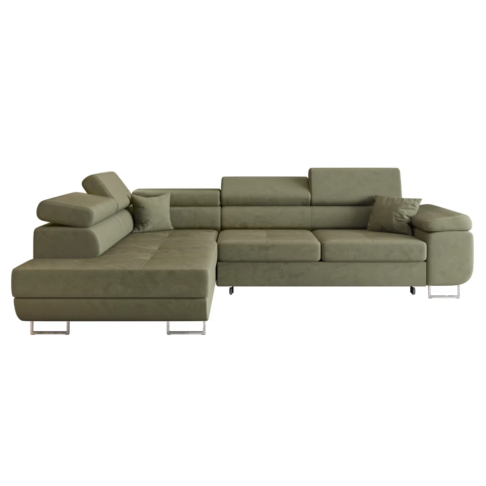 Rohová sedací souprava ANTON ROH v olivově zelené barvě má pevný rám z dřevotřísky a borového dřeva a je čalouněná látkou oděruodolná látka Kronos 46. Tato textilie dosahuje podle Martindale až 60 000 oděrek, což zajišťuje dlouhou životnost i při častém užívání. Rozměry celku činí 274 × 203 × 70/90 cm (š x hl x v) a po rozložení vznikne ložná plocha 198 × 125 cm. Výška sedu je 44 cm, hloubka 58 cm a šířka sedáku 139 cm. Součástí je prostorný ottoman 103 × 158 cm. Boční opěrky měří 35 × 100 × 60 cm a zádová opěrka má výšku 50 cm. Sedačka je celočalouněná, rozkládací a s úložným prostorem. Levé provedení doplňují kovové nožičky v stříbrné barvě s niklovým povrchem; výška spodního prostoru nad podlahou je 9 cm. Opěrky nabízejí 3 stupně polohování, výplň tvoří pružina falista a tuhost je T30. Dodáváno v demontu a součástí jsou i polštáře pro pohodlné sezení. Skvělá volba pro prostorný obývací pokoj, která kombinuje komfort s praktičností a moderním stylem.