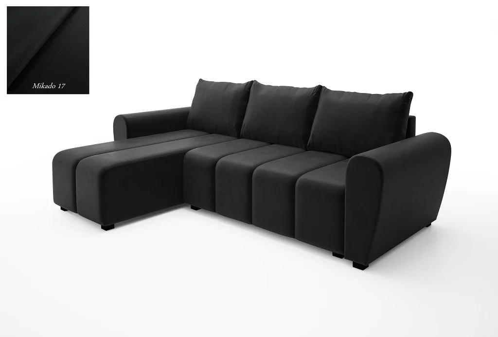Sedačka je plně očalouněná a díky tomu skvěle zapadne do každého interiéru. Potahová látka Mikado 17 je černá, což dodává eleganci a snadnou údržbu. Ilustrační fotografie rozložené varianty ukazuje jinou barvu; skutečná barva je černá. Rozměr (š x v x h): 246 x 82 x 145 cm, ložná plocha 200 x 130 cm, výška sedu 43 cm. Konstrukce kombinuje vlnitou pružinu a vysoce elastickou pěnu pro dlouhodobé pohodlí. Nízké plastové nohy dotvářejí moderní vzhled a usnadňují úklid pod sedačkou. Dodáváno v demontu, montáž je rychlá a bez složitého nářadí.
