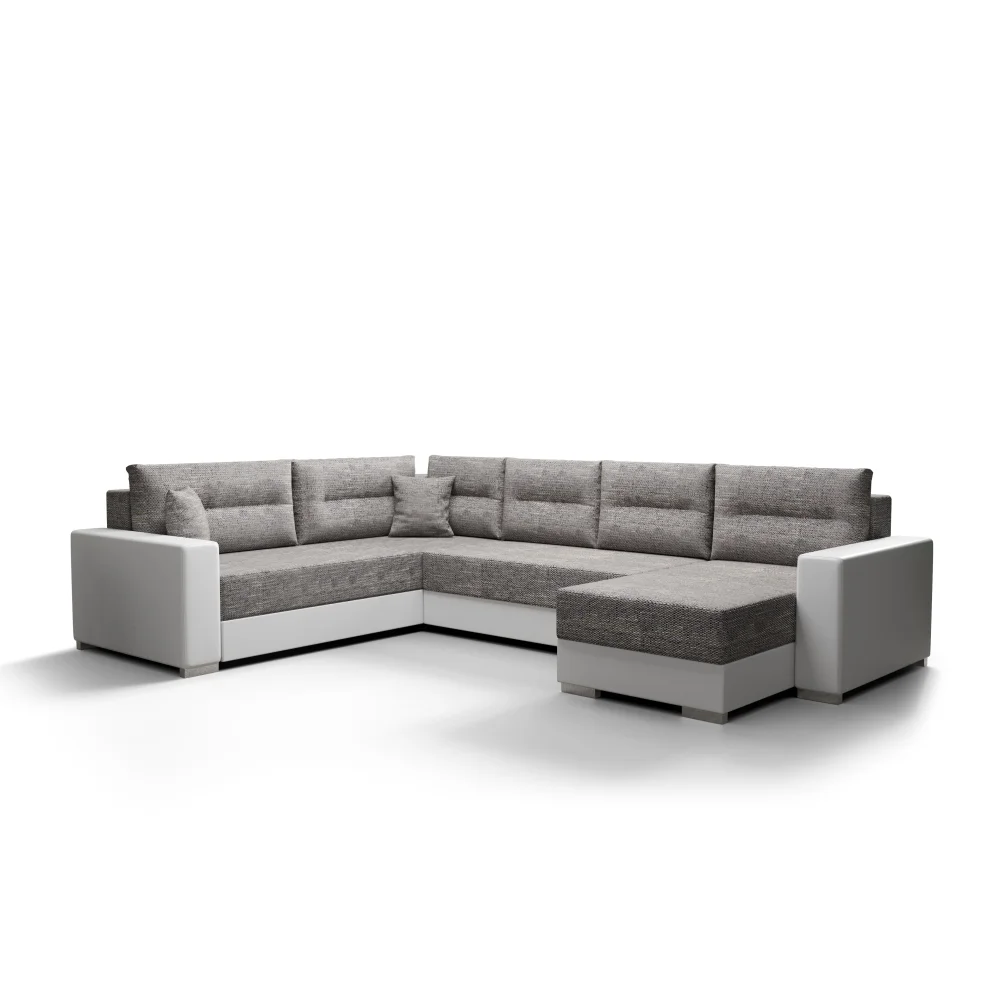 Rohová sedačka ve tvaru U je určena pro flexibilní uspořádání obýváku a nabídne pohodlné spaní pro hosty. Potahy kombinuje dvě varianty: kornet 02 šedá látka s bílým prošíváním a dolaro 511 bílá ekokůže.