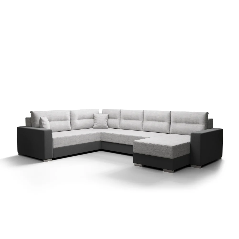 Rohová sedačka ve tvaru U nabízí prostorné posezení a snadné přizpůsobení prostoru. Dostupné varianty potahu zahrnují Kornet 18 (světle šedá látka s bílým prošitím) a Rainbow 27 (šedá látka).