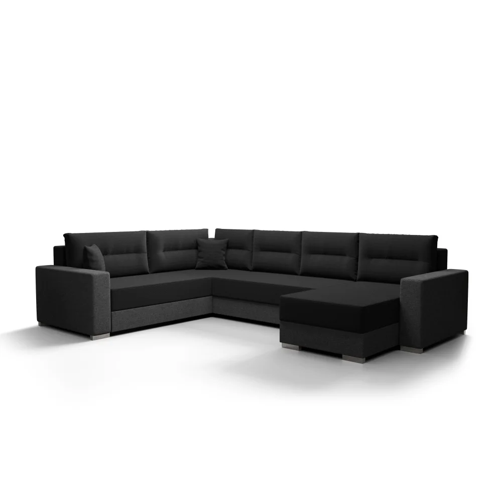 Rohová sedačka ve tvaru U nabízí prostorné sezení a pohodlné spaní. Univerzální provedení umožňuje snadné sladění do různých interiérů. Potahová látka je k dispozici ve dvou variantách: Sawana 14 v černé a Sawana 05 v tmavě šedé.
