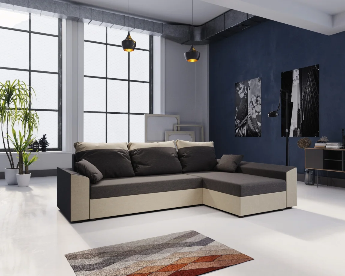 Rozkládací rohová sedačka BUSH je multifunkční řešení pro každý obývací prostor, které lze nastavit pro pravý i levý roh. K dispozici jsou potahy Sawana 21 v světle šedé a Sawana 01 v krémové barvě, vyberte si podle interiéru. Součástí jsou tři zadní polštáře se zipem, dekorativní 40x40 cm polštáře a praktický úložný prostor. Obrázek rozložené sedačky je ilustrační; skutečná barva se může lišit. Díky modulárnímu provedení ji lze snadno přizpůsobit různým dispozicím místnosti a ušetřit prostor. Rozměry: š 250 cm, hloubka 144 cm, výška 66 cm bez polštářů (80 cm s polštáři). Ložná plocha 200 x 130 cm. Výška sedu 37 cm, hloubka sedu 70 cm bez polštářů. Materiál kombinuje vlnitou pružinu a pěnu T30 pro optimální podporu. Dodáváno v demontu.