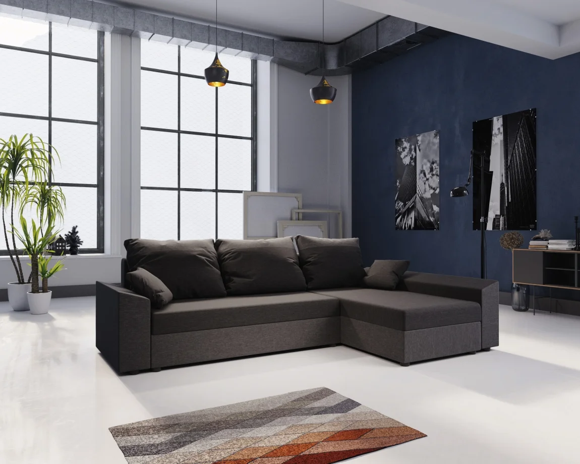 Univerzální rohová sedačka BUSH nabízí flexibilní uspořádání; roh lze snadno změnit na pravý i levý podle potřeby prostoru. Potahy nabízíme ve dvou odstínech látky Sawana: tmavě šedá Sawana 05 a světle šedá Sawana 21, které působí elegantně a zároveň jsou odolné vůči běžnému provozu. Součástí jsou 3 zadní polštáře se zipem a sada dekorativních polštářů 40 × 40 cm spolu s praktickým úložným prostorem. Obrázek rozložené sedačky je ilustrační a zobrazuje jinou barvu; skutečná varianta je dostupná ve dvou odstínech. Celkové rozměry rohové sekce činí 250 × 144 × 66 cm (bez polštářů), s polštáři dosáhne výšky přibližně 80 cm. Ložná plocha je 200 × 130 cm. Výška sedu je 37 cm a hloubka sedu 70 cm (bez polštářů). Základem je pružina vlnitá doplněná pěnou T30 pro komfortní sezení. Sedačka je dodávána v demontu. Navíc díky úložnému prostoru budete mít vždy pořádek a deky či povlečení po ruce.